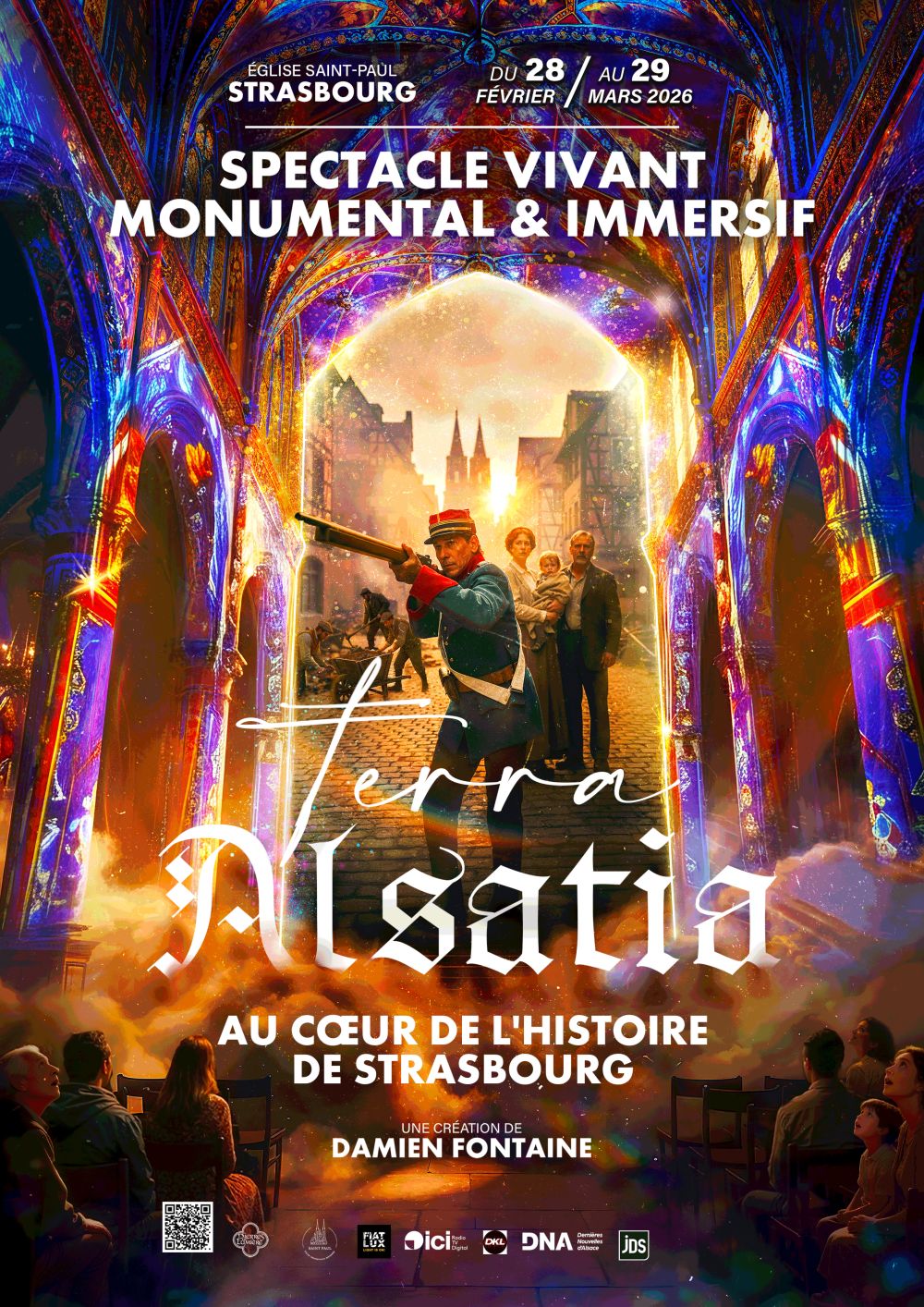 Dans l’écrin monumental de l’église Saint-Paul, Terra Alsatia plonge le spectateur au cœur de destins entremêlés, d’hommes et de femmes ballotés au gré des guerres de 1870 à 1945, sur fond d’exode, de trahisons mais aussi d’amour, de réconciliation et de spiritualité.